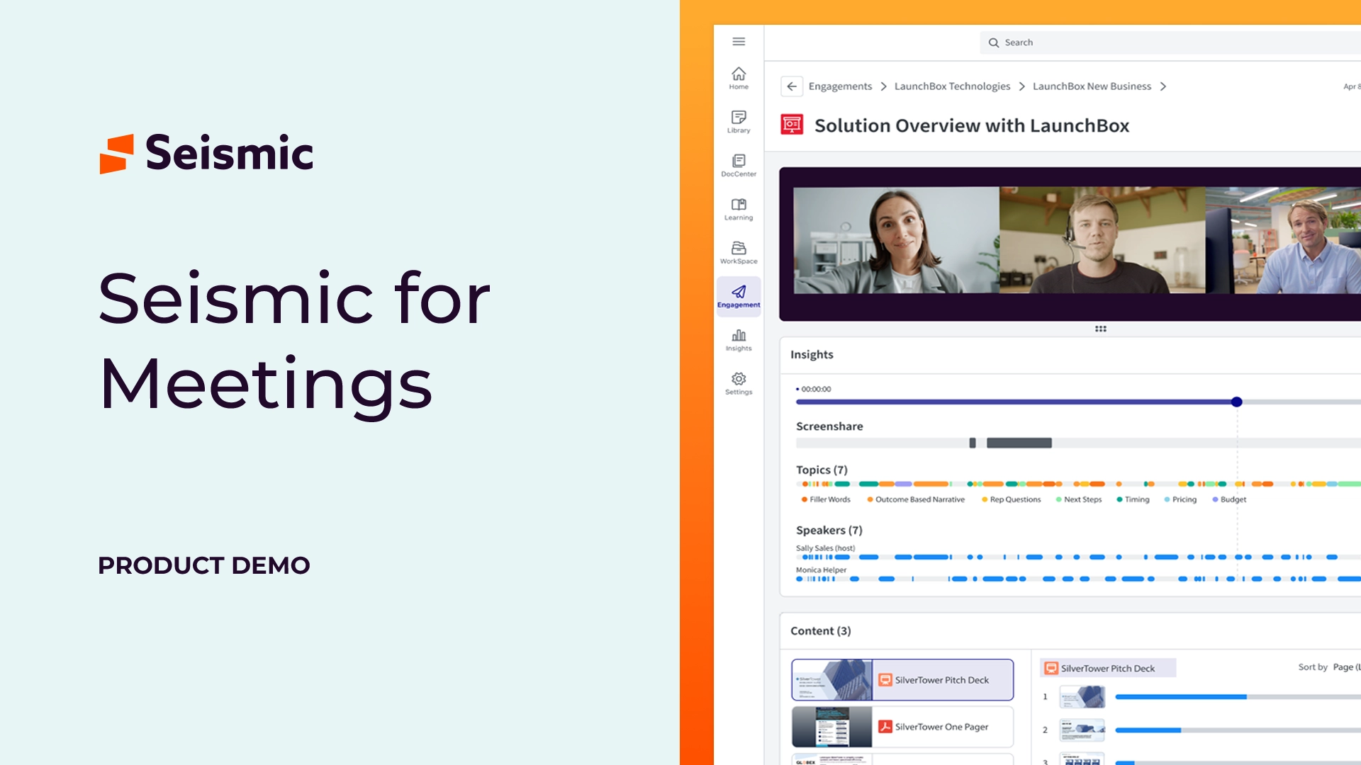 Customer meetings are pivotal moments in any deal, but with buyers offering less of their time, reps need to better prepare, present, and follow up on meetings to win their business. Seismic supports your reps every step of the way, so they can deliver stand-out customer experiences in a streamlined workflow.